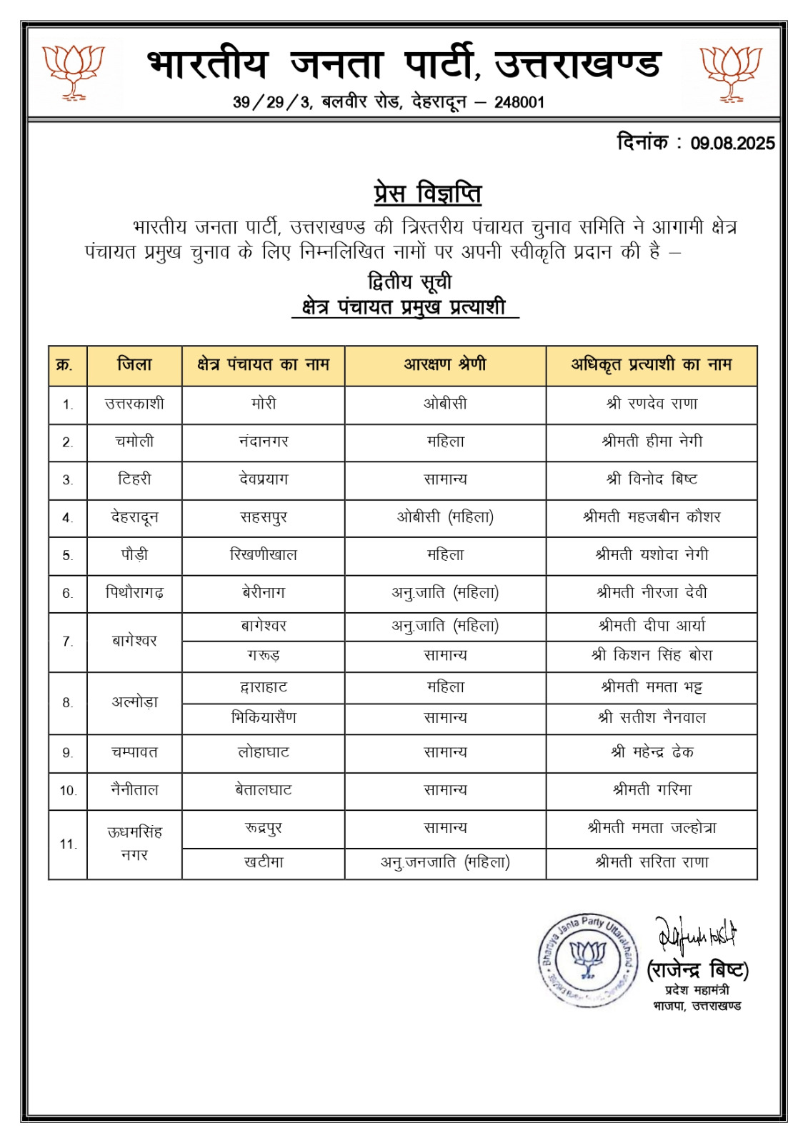 The post भाजपा ने जारी की जिला अध्यक्ष और प्रमुख प्रत्याशियों की दूसरी सूची जारी first appeared on Samachar UP UK.
