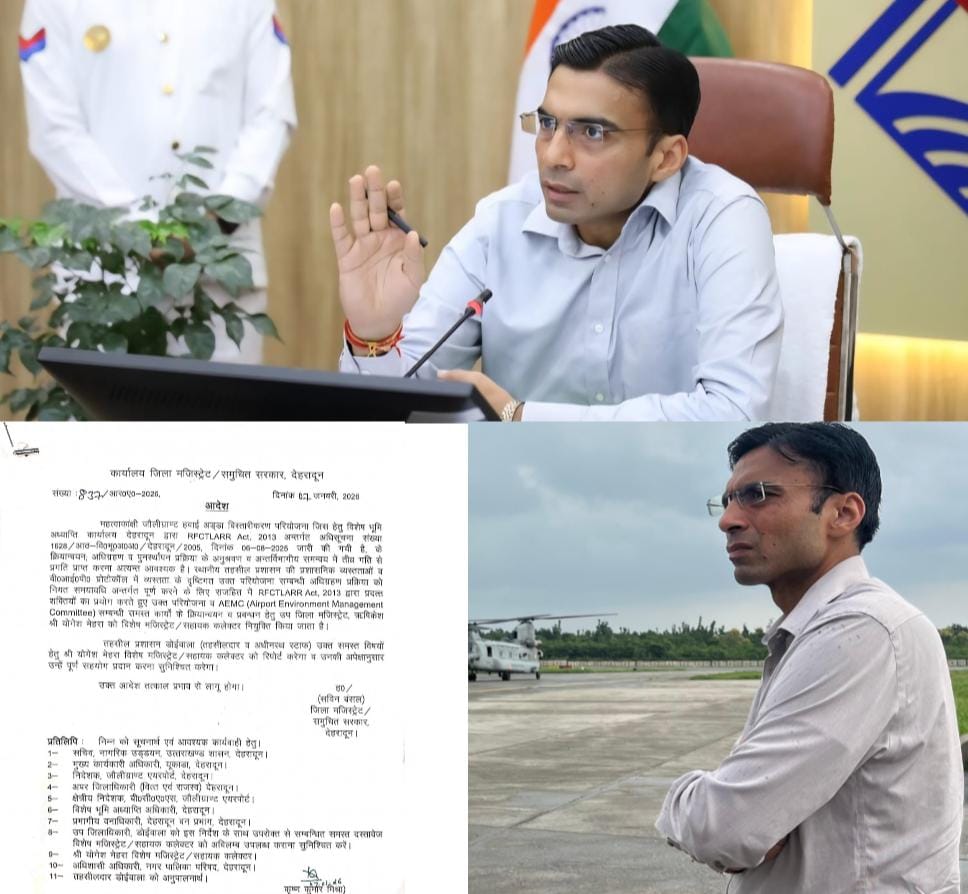 जौलीग्रांट एयरपोर्ट के विस्तार कार्य को गति देने के उद्देश्य से जिला प्रशासन ने एक महत्वपूर्ण कदम उठाया है। जिलाधिकारी सविन बंसल ने बुधवार को आदेश जारी करते हुए उप जिलाधिकारी ऋषिकेश योगेश मेहरा को विशेष मजिस्ट्रेट (नोडल अधिकारी) नियुक्त किया है डीएम यह नियुक्ति आरएफसीटीएलएआरआर एक्ट, 2013 (भूमि अधिग्रहण, पुनर्वासन एवं पुनर्स्थापन में उचित प्रतिकर और पारदर्शिता का अधिकार अधिनियम) के अंतर्गत जौलीग्रांट एयरपोर्ट विस्तार परियोजना से जुड़ी समस्त कार्यवाहियों के प्रभावी, पारदर्शी एवं समयबद्ध क्रियान्वयन के लिए की गई है