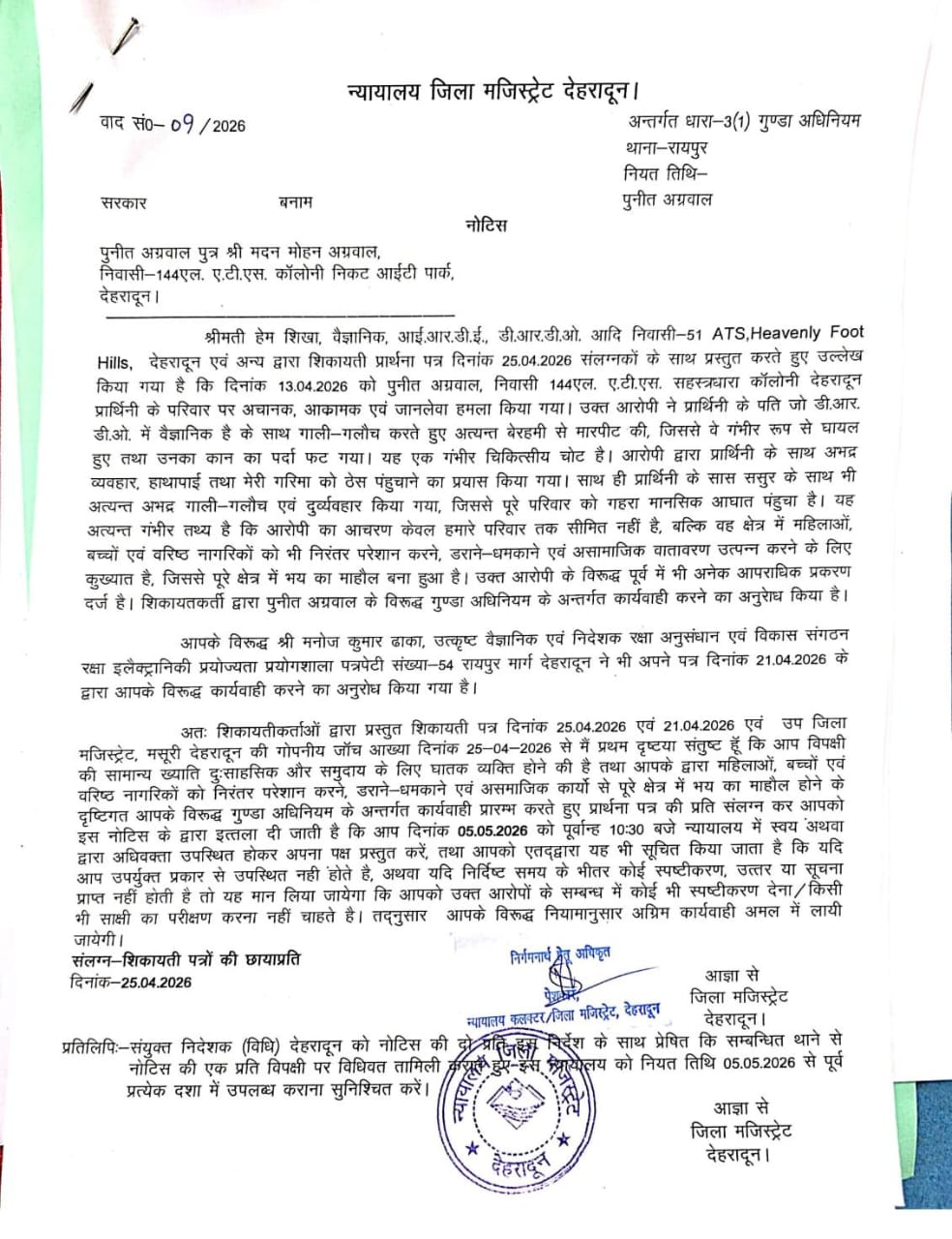 गुंडाएक्ट में किया बुक; जिला बदर की तैयारी बिल्डर के विरूद्ध बीएनएस की धारा 115 (2), 351(2), 352, 74,126(2), 324(4), 447 में पांच मुकदमें है दर्ज बिल्डर पर मारपीट, उत्पीड़न, पिस्टल तानने, बच्चों से गाली गलौच व गाड़ी से टक्कर मारने का प्रयास, धमकाने अभद्र भाषा का प्रयोग, स्थानिकों एवं आरडब्ल्यूए के सदस्यों को जानबूझकर झूठे मुकदमों एवं निराधार आरोपों में फंसाकर उत्पीड़न का प्रयास, कूटरचित रजिस्ट्री से विधवा महिला की भूमि पर अनाधिकृत आदि मामलों में दर्ज हैं 05 मुकदमें दबंगई कर जनमानस की जान जोखिम में डालने वालों पर डीएम की नजर; जिला बदर की कार्यवाही तय शहर के सहस्त्रधारा रोड स्थित एटीएस कालोनी में बिल्डर की गूंडागर्दी पर जिला मजिस्टेªट कोर्ट ने संज्ञान लेते हुए गुंडा एक्ट में नोटिस जारी करते हुए 07 दिन के भीतर प्रतिउत्तर प्रस्तुत करने के निर्देश दिए हैं प्रतिउत्तर प्राप्त न होने के की दशा में जिला बदर की कार्यवाही शुरू कर दी जाएगी। इससे पूर्व भी विवादित बिल्डर पर दीपावली में नाबालिग बच्चों पर पिस्टल लहराने तथा लाईसेंसी शस्त्र को प्रदर्शित करने पर डीएम ने शस्त्र लाईसेंसधारक पुनीत अग्रवाल की लापरवाही मानते हुए उनका शस्त्र जब्त करते हुए शस्त्र लाईसेंस निलम्बित कर दिया था। आरोपी बिल्डर पर डीआरडीओं वैज्ञानिक के साथ मारपीट एवं उत्पीड़न, नशे में धुत होकर एटीएस आरडब्ल्यूए अध्यक्ष के साथ मारपीट, बच्चों से गाली गलौच, दीपावली पर पिस्टल तानने, बच्चों से गाली गलौच एवं गाड़ी से टक्कर मारने का प्रयास, जनरल बाडी मीटिंग में धमकाने अभद्र भाषा का प्रयोग, आरोपी द्वारा निवासियों एवं आरडब्ल्यूए के सदस्यों को जानबूझकर झूठे मुकदमों एवं निराधार आरोपों में फंसाकर उत्पीड़न करने का प्रयास, विधवा महिला की भूमि को कूट रचित रजिस्ट्री एवं अनाधिकृत कब्जा मामलों विभिन्न धाराओं में 05 एफआईआर दर्ज हैं। जिलाधिकारी सविन बंसल ने जनमानस महिला, बुजुर्ग बच्चे, असहायों की सुरक्षा के दृष्टिगत समय-समय पर कड़े एक्शन लिए है। साथ ही अधिकारियों को सख्त निर्देश हैं कि कानून हाथ में लेकर ऐसा कृत्य करने वालों को किसी भी कीमत पर बख्शा नही जाएगा। बिल्डर के विरूद्ध बीएनएस की धारा 115 (2), 351(2), 352, 74,126(2), 324(4), 447 में पांच मुकदमें दर्ज हैं। तथा बिल्डर द्वारा आए दिन कोई न कोई विवाद किए जा रहे हैं, जनमानस की सुरक्षा के दृष्टिगत जिला मजिस्टेªट न्यायालय द्वारा स्वतः संज्ञान लेते हुए बिल्डर के विरूद्ध गुंडाएक्ट में बुक करते हुए जिला बदर की तैयारी कर दी है। ज्ञातब्य है कि शहर के सहस्त्रधारा रोड स्थित एटीएस कॉलोनी में बिल्डर की कथित दबंगई का मामला सामने आया है। बिल्डर पुनीत अग्रवाल पर नगर निगम/एमडीडीए की जमीन पर अवैध निर्माण के विरोध में 01 डीआरडीओ मे तैनात वैज्ञ