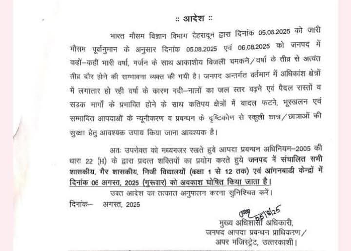उत्तरकाशी जिले में मौसम विभाग की चेतावनी को देखते हुए कल शासकीय, गैर शासकीय विद्यालयों (कक्षा 1 से 12 तक) और आंगनबाड़ी केंद्रों में अवकाश घोषित किया गया है