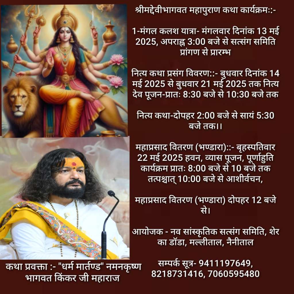 नैनीताल। सरोवर नगरी नैनीताल के नव सांस्कृतिक सत्संग समिति शेर का डांडा रामलीला मैदान में आगामी 13 मई से 22 मई तक श्रीमद देवी भागवत कथा का आयोजन किया जाना है। जिसकी व्यापक तैयारी की जा रही है। इस अवसर पर एक बैठक आयोजित की गई बैठक की अध्यक्षता समिति के अध्यक्ष खुशाल सिंह रावत व संचालन महासचिव पी सी पांडे ने किया। इस मौके पर क्षेत्र की तमाम महिलाओं ने भी हिस्सा लिया। समिति द्वारा कई सदस्यों को जिम्मेदारी भी सोपी गई। समिति अध्यक्ष खुशाल सिंह रावत व महासचिव पी सी पांडे ने बताया 13 मई को शेर का डांडा रामलीला मैदान में मंगल कलश यात्रा का शुभारंभ किया जायेगा। 14 मई से प्रतिदिन 22 मई तक सुबह पूजा अर्चना के बाद दिन में भागवत किंकर श्री श्री नमन कृष्ण महाराज अपनी टीम के साथ भागवत कथा की अमृतमयी वर्षा करेगें। समिति के तमाम सदस्यों ने क्षेत्र की जनता से अपील की है अधिक से अधिक संख्या में पहुँचने की अपील की है।