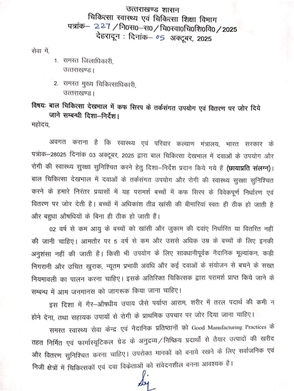 भारत सरकार, स्वास्थ्य एवं परिवार कल्याण मंत्रालय की ओर से 3 अक्टूबर 2025 को जारी एडवाइजरी के अनुपालन में राज्य में भी बच्चों में कफ सिरप के विवेकपूर्ण उपयोग और वितरण पर विशेष बल दिया गया है।