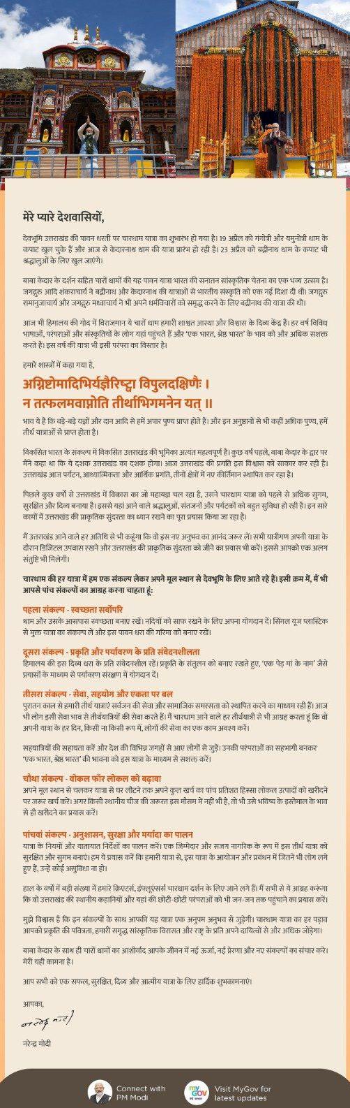 प्रधानमंत्री नरेंद्र मोदी ने चारधाम यात्रा शुरु होने पर देशवासियों को शुभकामना संदेश देते हुए, उत्तराखंड आने वाले तीर्थयात्रियों से पांच संकल्पों का पालन करने का आग्रह किया है
