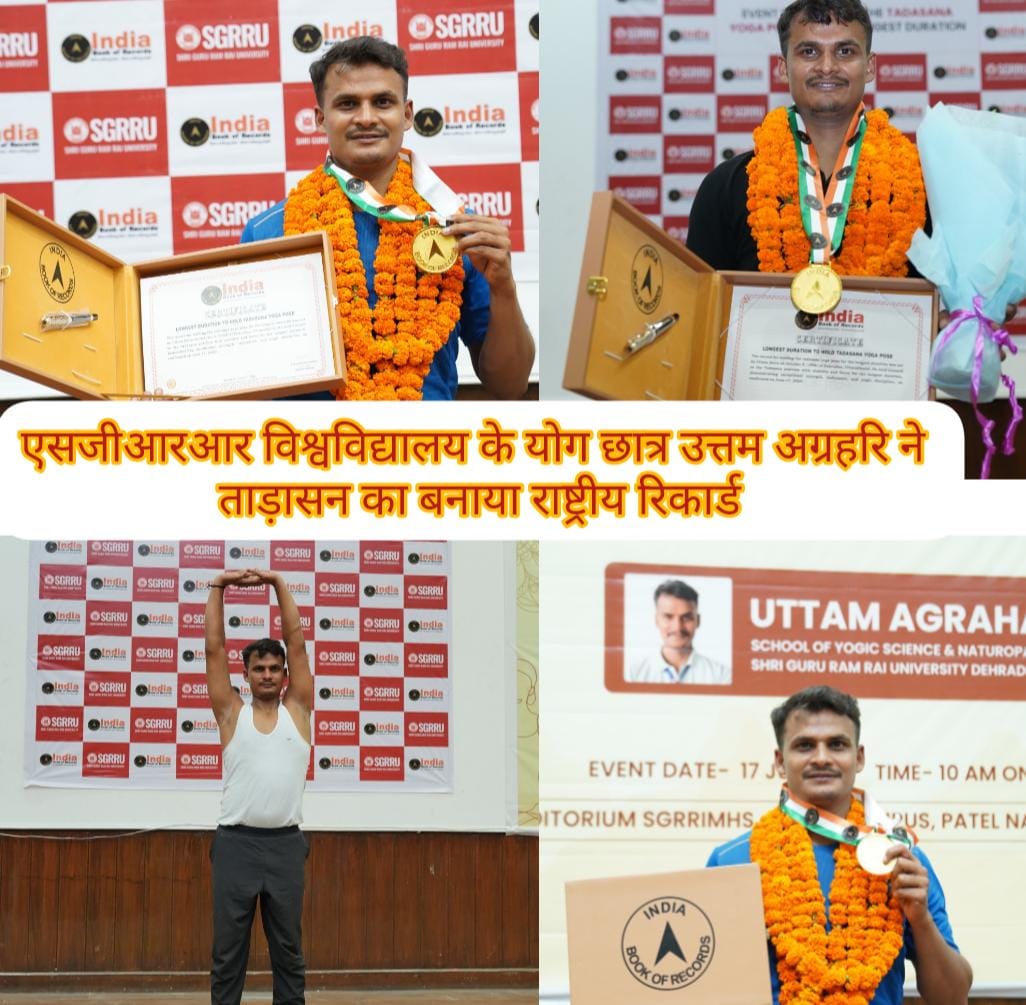 रिकाॅर्ड बनाया है। उन्होंने मंगलवार सुबह ताड़ासन की एक ही मुद्रा में लगातार 3 घण्टे 3 मिनट तक खड़े रहकर यह उपलब्धि हासिल की। इण्डिया बुक आफ रिकाॅर्डस में उत्तम का यह रिकाॅर्ड दर्ज किया गया। इण्डिया बुक आफ रिकाॅर्डस की प्रतिनिधि डाॅॅ श्वेता झा की माॅजूूदगी में राष्ट्रीय रिकार्ड की रिकार्डिंग दर्ज की। श्री गुरु राम राय विश्वविद्यालय के माननीय प्रेसीडेंट श्रीमहंत देवेन्द्र दास जी महाराज, कुलपति डाॅ (प्रो.) कुमुद सकलानी एवम् कुलसचिव डाॅ लोकेश गम्भीर ने उत्तम अग्रहरि को इस उपलब्धि पर बधाई एवम् शुभकामनाएं दीें इण्डिया बुक आफ रिकाॅर्ड्स, एशिया बुक आॅफ रिकार्ड्स की अनुवांशिक संस्था है। एशिया बुक आफ रिकाॅर्डस में 48 एशियन देश सदस्य हैं। एशिया बुक आफ रिकार्डस का प्रधान कार्यालय वियतनाम में है। इण्डिया बुक आफ रिकाॅर्ड्स का प्रधान कार्यालय फरीदाबाद, हरियाणा में है। इण्डिया बुक आफ रिकाॅर्ड्स में अब तक 40,000 (चालिस हज़ार) रिकाॅर्ड्स दर्ज हो चुके हैं। श्री गुरु राम राय विश्वविद्यालय के स्कूल आफ योगिक साइंस एण्ड नैचुरोपैथी के छात्र-छात्राएं पूर्व में भी राष्ट्रीय एवम् अन्तर्राष्ट्रीय स्तर पर इस प्रकार के रिकार्ड्स बना चुके हैं। विश्वविद्यालय प्रबन्धन समय समय पर ऐसे छात्र-छात्राओं को प्रोत्साहित करता रहता हैvउत्तम अग्रहरि श्री गुरु राम राय विश्वविद्यालय से एमएससी योगिक साइंस एण्ड आल्टरनेटिव थेरेपीज़ का कार्से कर रहे हैं। डीन डाॅॅ कंचन जोशी ने जानकारी दी कि उत्तम अग्रहरि योग के एक मेधावी छात्र हैं जिसका परिणाम यह राष्ट्रीय रिकाॅर्ड है। उत्तम के इस राष्ट्रीय रिकार्ड से श्री गुरु राम राय विश्वविद्यालय का नाम देश विदेश में रौशन हुआ है। उत्तम ने अपनी योग साधना से योग के महत्व को देश विदेश में प्रचारित प्रसारित करने का काम किया है। श्री गुरु राम राय विश्वविद्यालय के माननीय प्रेसीडेंट श्रीमहंत देवेन्द्र दास जी महाराज ने उत्तम की प्रतिभा को पूर्व में भी सम्मानित किया है। उत्तम अग्रहरि की सम्पूूर्णं उच्च शिक्षा की जिम्मेदारी श्री गुरु राम राय विश्वविद्यालय वहन कर रहा है व साथ उनके रहने व भोजन की व्यवस्था भी विश्वविद्यालय प्रबन्धन लंबे समय से करता आ रहा है। इस अवसर पर डाॅ मालिविका सती कांडपाल, डाॅ सुरेन्द्र प्रसाद रयाल, डाॅ सरस्वती काला, डाॅ अनिल थपलियाल, डाॅ बिजेन्द्र सिंह, डाॅ प्रेरणा, डाॅ ओम नारायण तिवारी भी उपस्थित थे