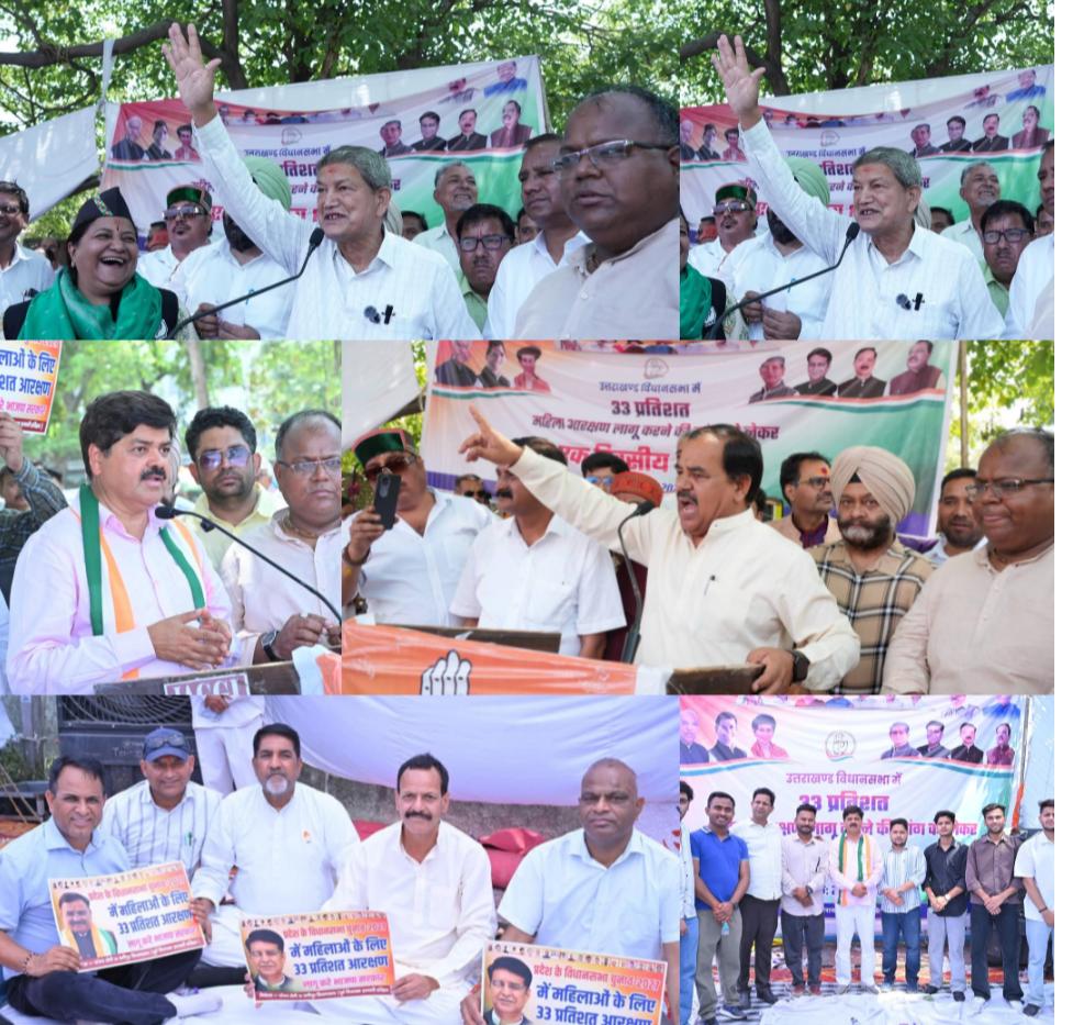 पूर्व निर्धारित कार्यक्रम के तहत आज कांग्रेस पार्टी के वरिष्ठ नेताओं के साथ ही सैकडों की संख्या में एकत्र कांग्रेस कार्यकर्ताओं ने विधानसभा भवन के सामने एक दिवसीय धरना देते हुए राज्य विधानसभा में 33 प्रतिशत महिला आरक्षण लागू किये जाने की मांग की। कार्यक्रम में पूर्व मुख्यमंत्री हरीश रावत, प्रदेश चुनाव अभियान समिति के अध्यक्ष प्रीतम सिंह, प्रदेश चुनाव प्रबन्धन समिति के अध्यक्ष डॉ0 हरक सिंह रावत, राष्ट्रीय प्रवक्ता आलोक शर्मा, विधायक ममता राकेश, अनुपमा रावत, रवि बहादुर आदि ने प्रतिभाग किया। कार्यक्रम का संचालन महानगर अध्यक्ष डॉ0 जसविन्दर सिंह गोगी एवं ओम प्रकाश सती बब्बन ने संयुक्त रूप से किया।